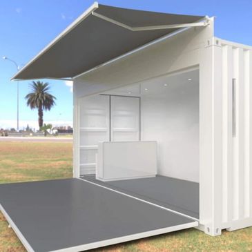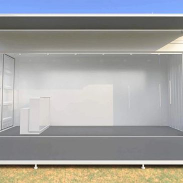 The customised container's interior walls are paint finished in white or Black on the original architectural corrugation finish. The rear wall features a solid flat wall that provides a natural graphic backdrop opportunity, this is also flexible to support digital media and screens if required.