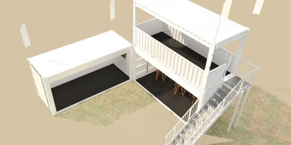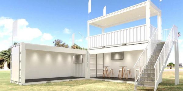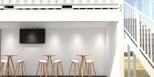 The customised container features an upper deck with a concealed roof, accessible by a single external stair unit. The sheltered gallery provides an exceptional environment for up to twelve guests, come rain or shine, great for use as a viewing platform, additional consumer space, product demonstration area or presentation podium.