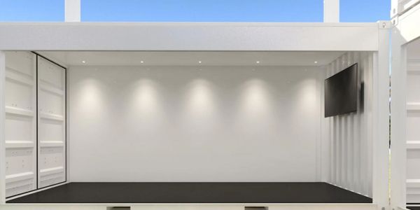 The customised container opens to the front through a roller door system that helps to provide a full 20' to two 6m access entrances to the internal container environments. The floor space is then extended to the exterior, providing an extended experiential environment using an anti-slip vinyl stage surface that expands to 6m x 2m.